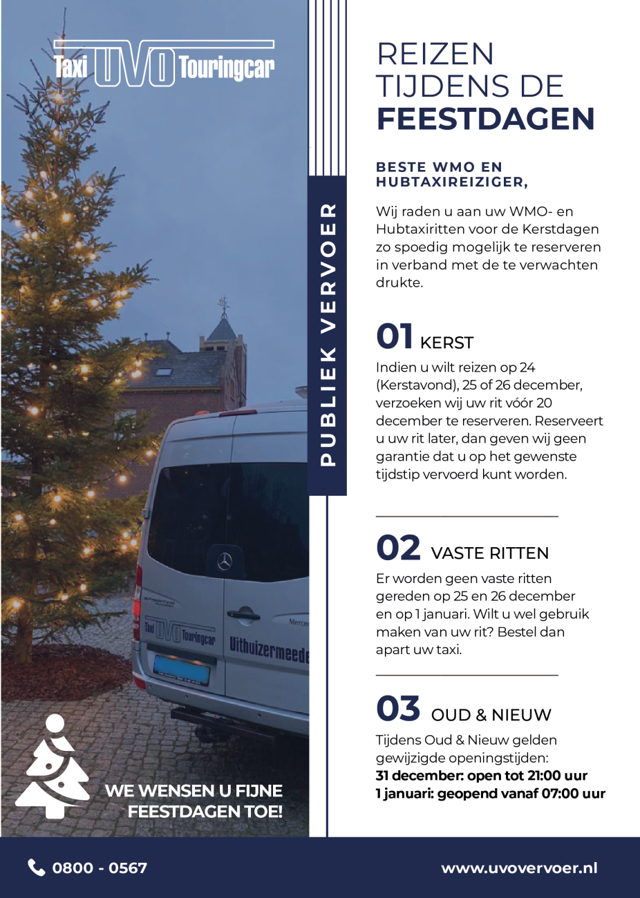 Voor verdere informatie en voor het reserveren van een rit tijdens de feestdagen bekijk onderstaande flyers of neem contact op met uw vervoerder.